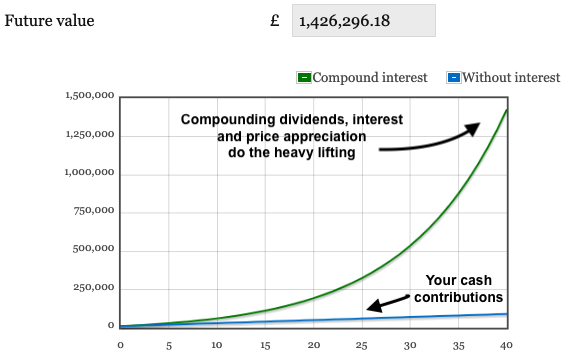 If you were to invest £100 per month for 5 years, you would end up with over £7000. That is obviously great but doesn’t sound very impressive. However, If you continued to invest £100 for a total of 40 years you would end up with…